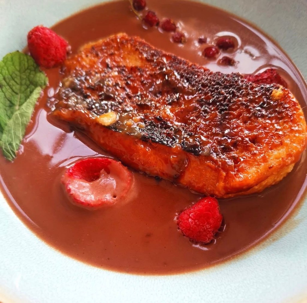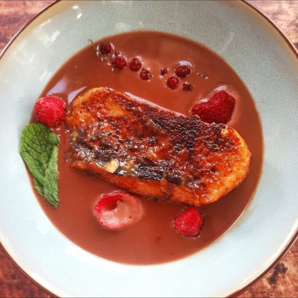 Sirve la sopa de chocolate muy caliente en un bol o plato hondo. Coloca la torrija en el centro. Decora con frutos rojos y menta fresca para dar contraste, frescor y color.