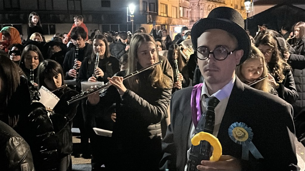 En las calles del centro histórico, el negro del luto es más un disfraz compartido que una imposición. Hay gente apretada en las aceras, niños subidos a hombros, móviles en alto buscando capturar el instante. La humedad del invierno se mezcla con el vapor que asciende del río Umia. Y, entre el murmullo expectante, suena una banda. La melodía empuja el cortejo como si las notas también cargaran el ataúd.