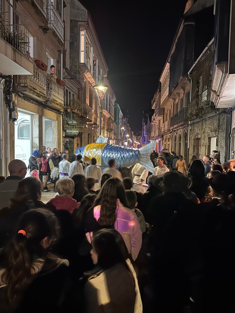 La ceremonia tiene su propio itinerario sentimental. El velatorio comienza en A Tafona, punto de encuentro donde la sardina —protagonista indiscutible— recibe las primeras “muestras de duelo”. Allí se congregan vecinos, asociaciones culturales y músicos que acompañarán el recorrido.