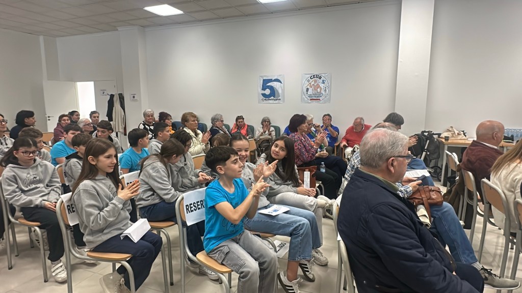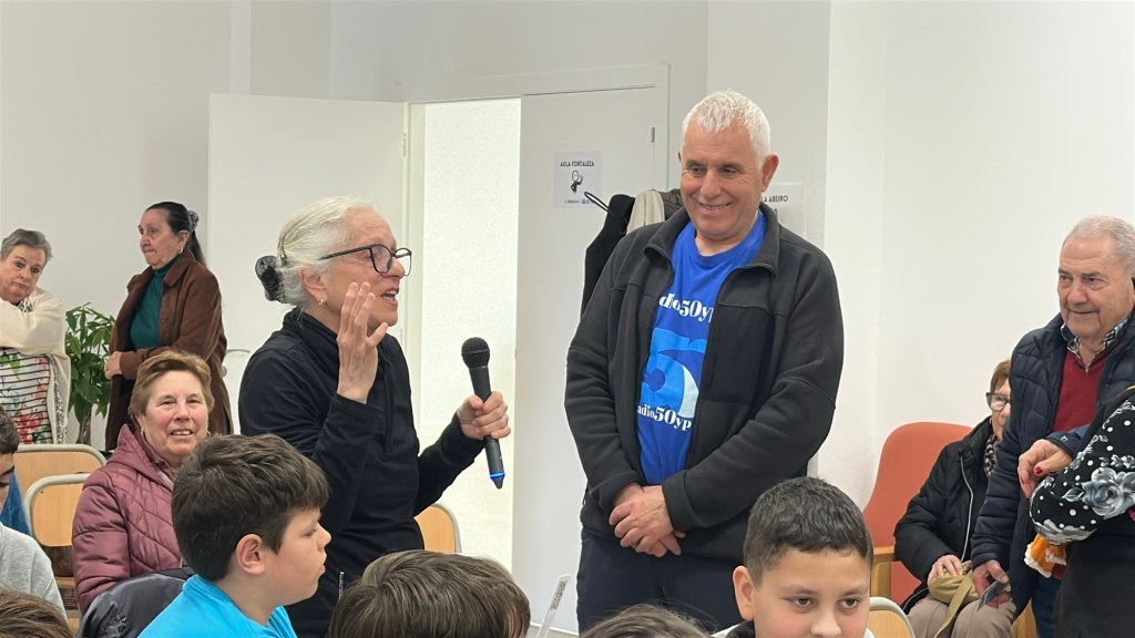 Niños participando en la radio, mayores tomando la palabra, miradas cruzadas entre curiosidad y admiración.
