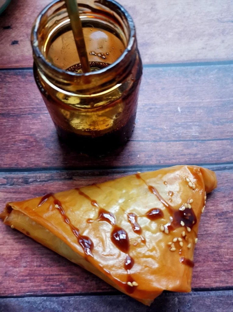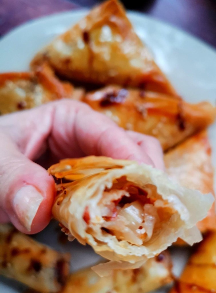 Con el relleno ya listo, llega el momento del montaje. Se funde un poco más de mantequilla y se utiliza para pincelar las láminas de masa filo, un paso fundamental para que queden doradas y crujientes en el horno. Después, se reparte el relleno y se da forma a las piezas, pudiendo optar por samosas triangulares o por rollitos, según la presentación deseada.