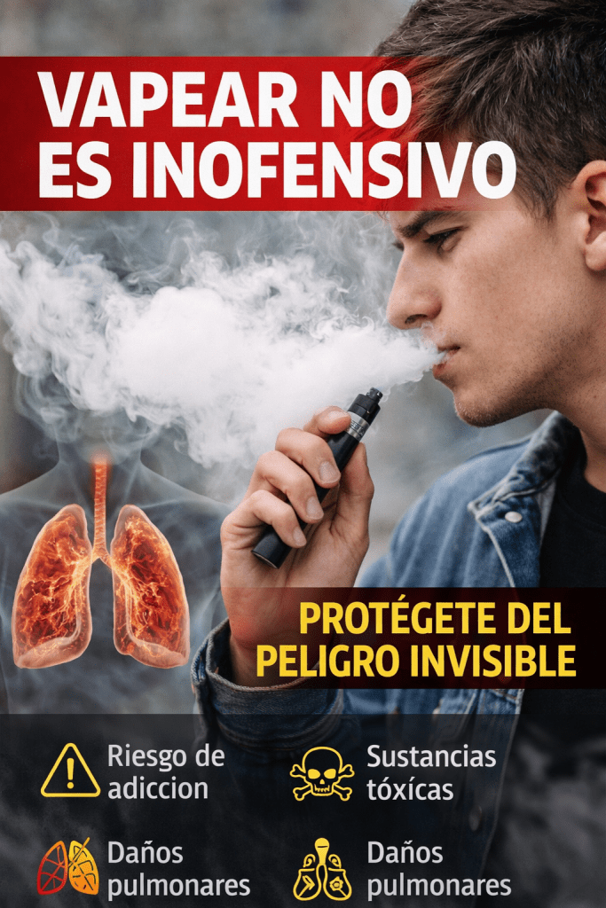 El problema no es solo la nicotina. El aerosol de los cigarrillos electrónicos puede contener sustancias químicas, aromatizantes y otros compuestos potencialmente dañinos. En un informe oficial, el Ministerio de Sanidad de España advirtió que los cigarrillos electrónicos “no son seguros para el consumidor”, que a corto plazo se han visto efectos respiratorios y nuevas patologías como EVALI, y que el aerosol contiene sustancias tóxicas y carcinogénicas.