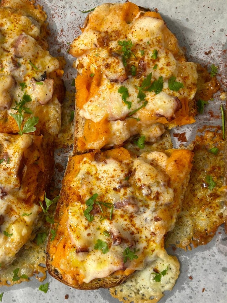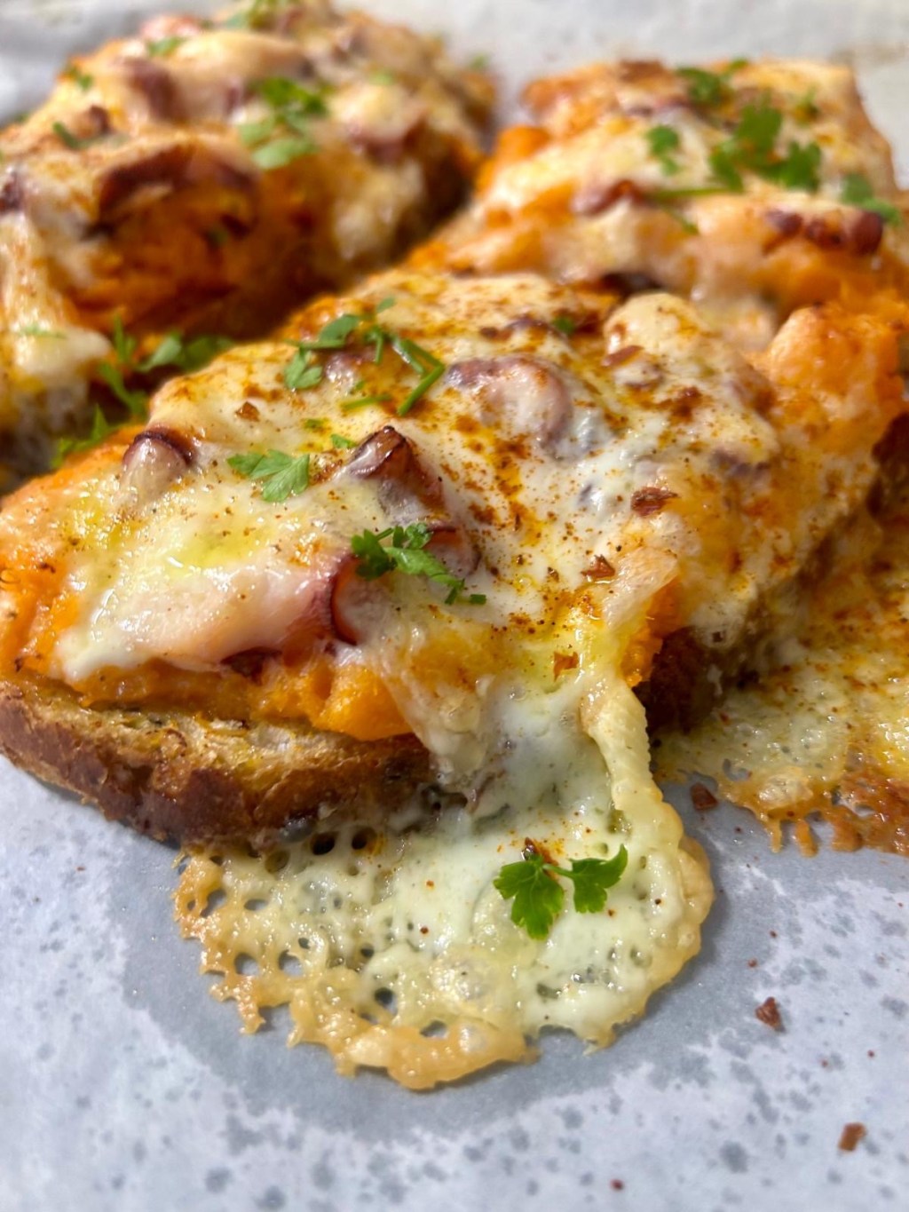 Estas tostas son ideales para una cena especial o un picoteo gourmet. La suavidad del boniato y la cremosidad del queso fundido elevan el pulpo a otro nivel. Además, el pulpo con queso de Arzúa-Ulloa es una combinación gallega ganadora, y el toque dulce del boniato equilibra a la perfección los sabores salados.