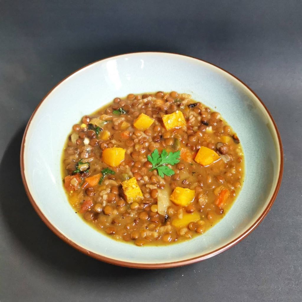 Servimos las lentejas calientes y añadimos por encima un par de cucharadas de calabaza asada.